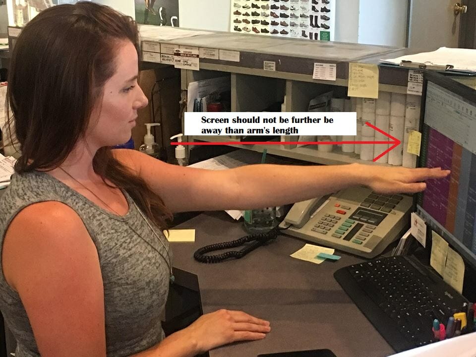 If your screen is positioned too far away from you, you’ll start craning your neck and squinting your eyes in order to read your screen. Our Chiropractors do not think this a good idea. Reach out your arm, and your middle fingertip should touch your screen. This is the correct ergonomic screen distance. To adjust your screen to the proper height, move the screen so that when you are looking straight ahead you are looking at the address bar on your screen. If you need to bump your screen up, you can use books or even designated risers to boost the height. If you use two monitors at work, they should be set up side by side. You don’t want to have to turn your head to look at either of your screens!